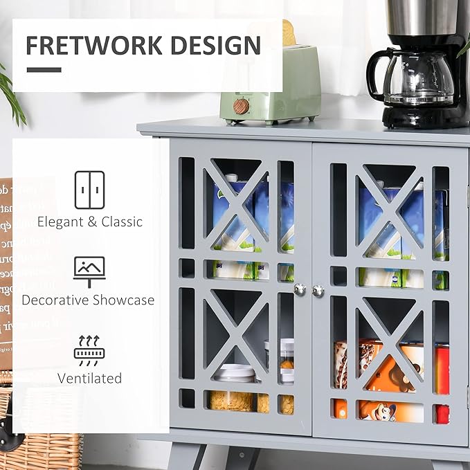 HOMCOM Sideboard Buffet Cabinet, Kitchen Storage Cabinet, Accent Cabinet with Double Fretwork Doors and Metal Handles for Living Room, Gray