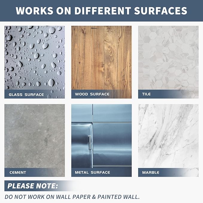 - 【 Works on Different Surfaces 】Those black adhesive hooks work on different surfaces such as wood, marble, clipboard, ceramic tile, glass, plastic, stainless steel and metal. Do not work on the paint wall and wall paper. It will damage the wall surface.