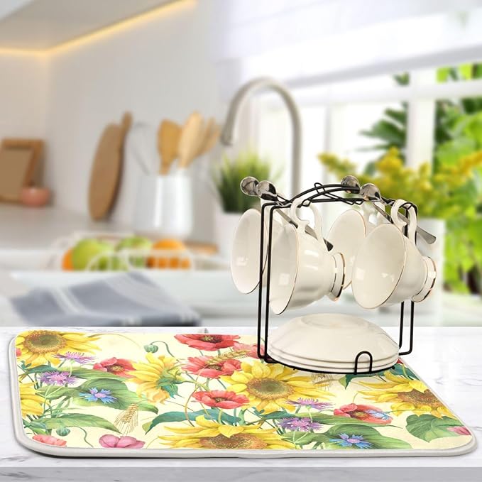 Fall Dish Drying Mat Microfiber Dish Drying Pads Kitchen Counter Draining Pad Sunflower Cornflower Poppy 16 x 18 Inches