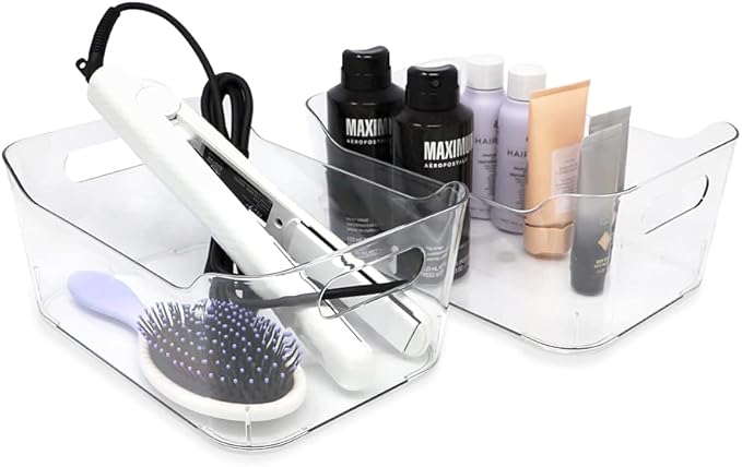 - CLEAR ORGANIZATION: Organization is easy with these small plastic storage bins. You’ll forget you ever had a junk drawer with our storage solution. Place the 2 matching bins side by side on a desk, or stow in drawers, cabinets, cupboards, & pantries. These containers are clear so you can see what’s inside, while the cutout handles & open top allow for quick access. Our clear organizers are durable & hold your essentials in one spot, from sewing supplies / yarn to medicine, vitamins, & first aid.