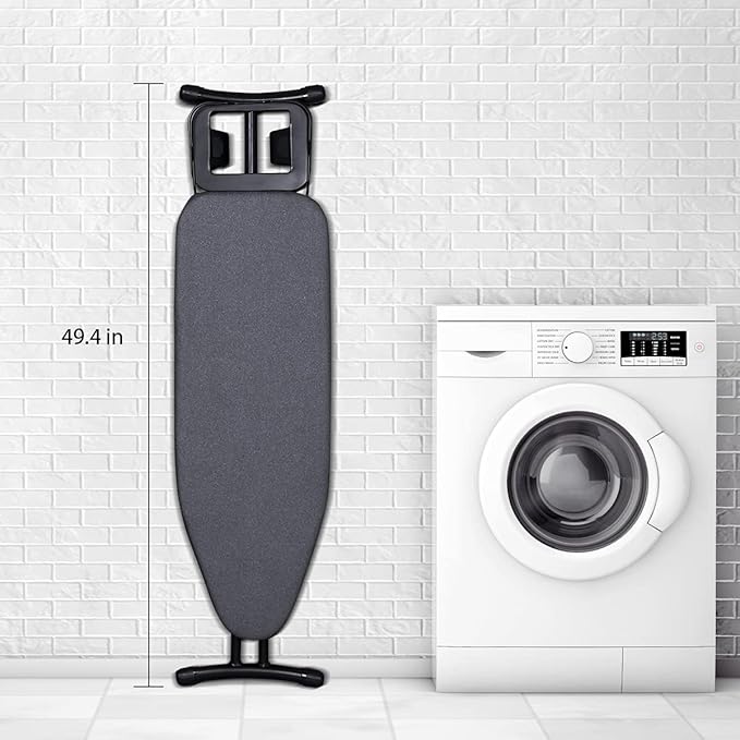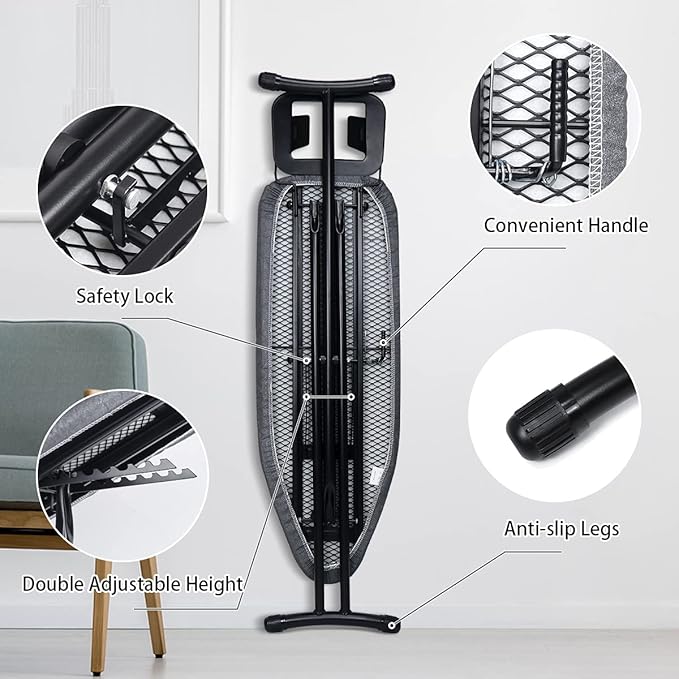 - Heavy Sturdy Ironing Boards:30 mm wide not-slip legs and children safety lock, make sure the whole structure strong and stable. Whole metal frame with classic black powder coating finish, looks new and last longer time