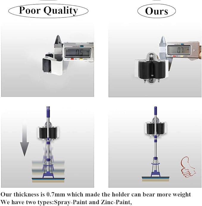 - EASY TO USE: Because mop broom holder wall mounted is made of 0.7mm thick metal material instead of 0.5mm as most of the ones on the market, you don’t have to worry about deformation even if you use it indoors or outdoors for a long time.You can slide the broom in and out with one hand. Unlike plastic mop holders with spring-loaded rollers, this broom organizer wall mount has rubber rollers to hold the handles, allowing the handle to slide in from the front and be held firmly in place.