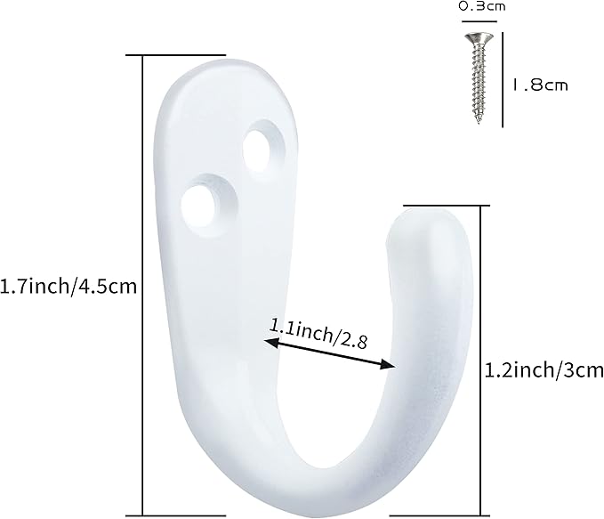 - Size: the clothes hook dimension is 45 x 34 mm or 1.7 x 1.3 inches, screws are 18 mm long and 3 mm in screw head diameter, easy for installation