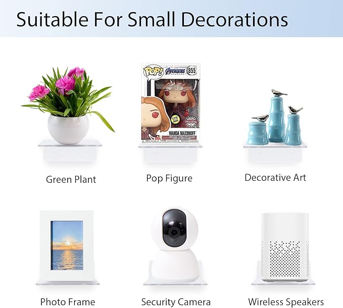 - 【Mini Size 】: Each display shelf measures 3.93" L x 3.93" W x 1.57" H, Weight capacity is 4.8lb if installed by screws, and it can hold up to 3.0lb if installed by tapes. Made of durable acrylic with a sleek surface, and smooth rounded edges.