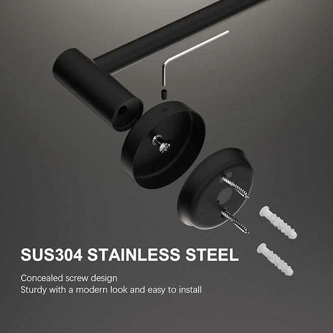 - Sturdy, Durable and Modern Design: Simple and stylish style in your bathroom, never out of date and reliable. Sleek surfaces, no sharp edges, safely hang the bath towel, bathrobe, pants and shirt, swimsuits, coats, bags, shower caddy or other stuff. 304 stainless steel to make the towel rod more durable and more anti-rust.