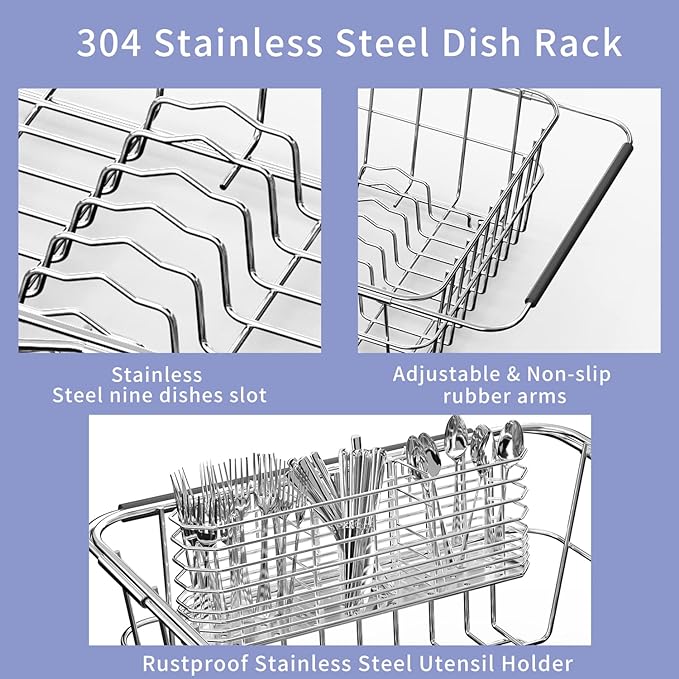 JAQ Dish Drainer in Sink Adjustable 14.96" to 20.59", Expandable 304 Stainless Steel Metal Dish Drying Rack Organizer with Stainless Steel Utensil Holder Over Inside Sink Counter