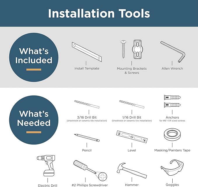 - Easy installation: all mounting hardware, template and guide included