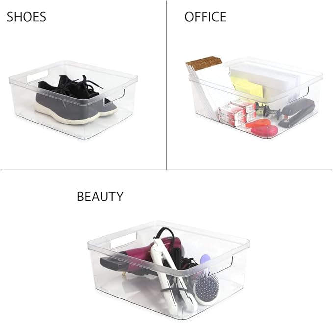 - CLEAR DESIGN: Staying organized is easy with these modern, clear plastic bins. The cutout handles make it easy to hold and carry from room to room. The transparent design of each bin enables you to quickly see what’s stored in each container; ideal for when you’re on-the-go. These modern bins are designed to blend into the décor of any room while cleaning up the mess on your desk, closet shelves, counterspace and tabletops. [Dimensions of each bin: 11.5” L x 14” W x 5.5” H]