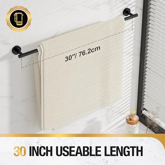 - 30 Inch Useable Dimension: The useable length of hanging the towel is 30 inch. Total length of towel bar is 31.6 inch. It is recommended to hang 1 bath towel or 2 hand towels or 2 washcloths.
