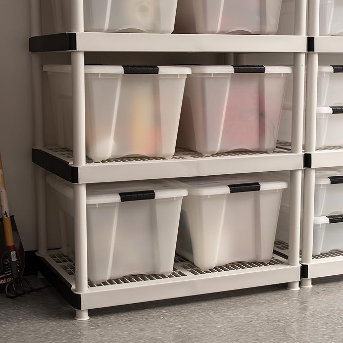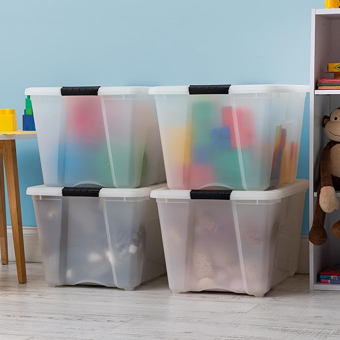 IRIS USA 54 Qt Stackable Plastic Storage Bins with Lids, 4 Pack - BPA-Free, Made in USA - Discreet Organizing Solution, Latches, Durable Nestable Containers, Secure Pull Handle - Pearl