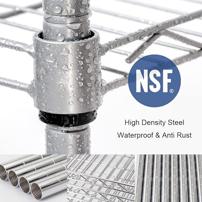 - DURABLE AND STURDY: Our 5 tier storage shelf is made of chrome plated steel tube and wire which is NSF certified. The max weight capacity of each layer is up to 250lbs. Its sturdiness can well guarantee that the shelving will not wobble after putting stuff on it.