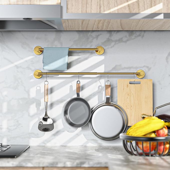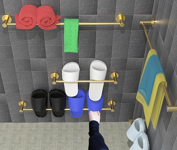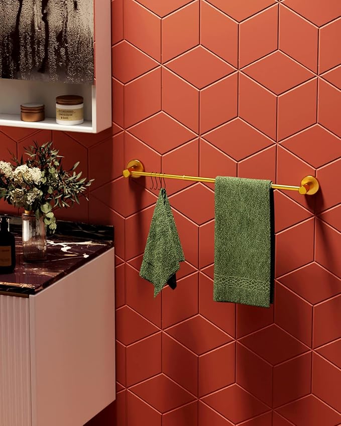 - Sturdy, Durable and Modern Design: Simple and stylish style in your bathroom, never out of date and reliable. Sleek surfaces, no sharp edges, safely hang the bath towel, bathrobe, pants and shirt, swimsuits, coats, bags, shower caddy or other stuff. 304 stainless steel to make the gold towel rod more durable and more anti-rust.