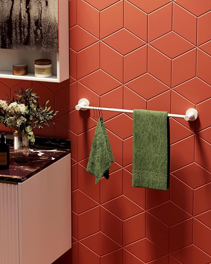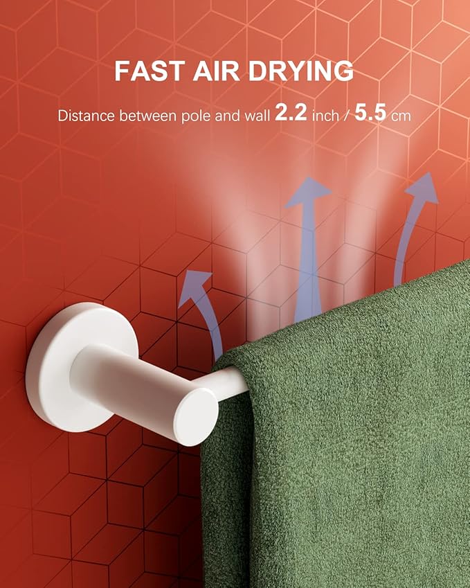 - Sturdy, Durable and Modern Design: Simple and stylish style in your bathroom, never out of date and reliable. Sleek surfaces, no sharp edges, safely hang the bath towel, bathrobe, pants and shirt, swimsuits, coats, bags, shower caddy or other stuff. 304 stainless steel to make the oil rubbed white towel rod more durable and more anti-rust.