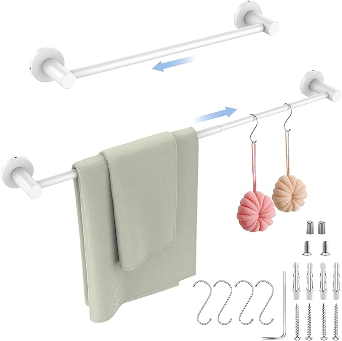- Sizes and Material: Retractable Single bath towel bar from 16 Inch to 27.6 Inch, 1.0 inch/2.5cm tube diameter,screws length 1.6"/ 4cm,you can install it in any length if you wish. Spreading out your towels fully with this towel bar, speed up drying.Constructed of SUS304 premium thicken,ANTI-RUST solid and durable stainless steel. Perfectly smooth oil rubbed white finish is built to resist daily scratches, corrosions, and tarnishing.