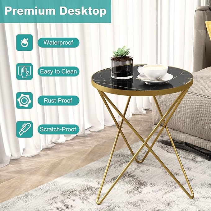 HLR Modern Round Side Table, End Table with Marble Effect Top and Gold Metal Frame, Small Side Table for Living Room, Bedroom, Sofa and Couch, Gold Legs, Black Marble top