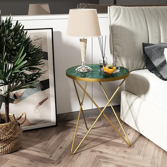 HLR Modern Round Side Table, End Table with Marble Effect Top and Gold Metal Frame, Small Side Table for Living Room, Bedroom, Sofa and Couch, Gold Legs, Green Marble top