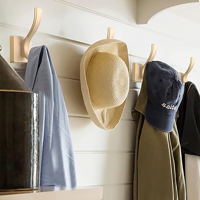 Gold Hooks for Wall Double Hooks, Heavy Duty Thick Bathroom Coat Hooks for Hanging Key Robe Hat Backpack, Wall Mount Hat Hooks Bath Towel Hooks(6 Pack, Gold)