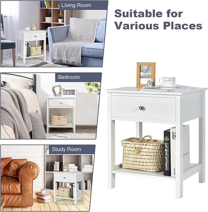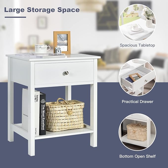 Giantex Nightstand Set of 2, Wood End Table with Drawer and Open Shelf, Night Stand for Small Spaces, 2-Tier Bedside Table for Living Room Bedroom Dorm, Easy Assembly, White