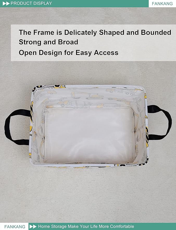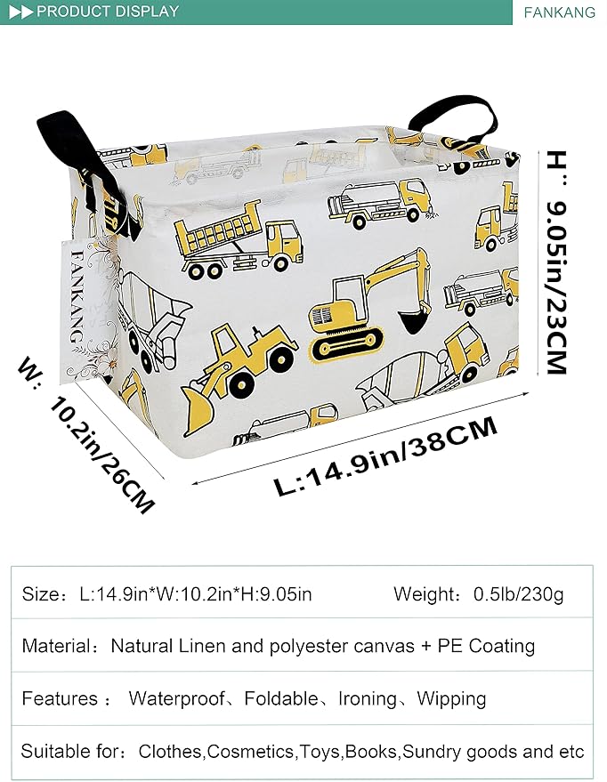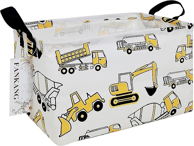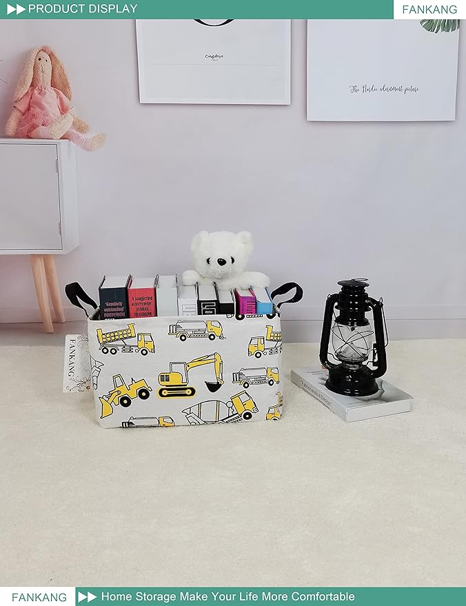 FANKANG Storage Bins, Nursery Hamper Canvas Laundry Basket Foldable with Waterproof PE Coating Large Storage Baskets for Kids Boys and Girls, Office, Bedroom, Clothes,Toys(Rec-excavator)