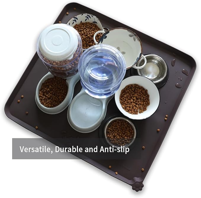 Hoki Found XX-Large Silicone Pet Food Mats - Non Slip Cat Dog Bowl Mats - Waterproof Dog Cat Food Tray - Dark Oak