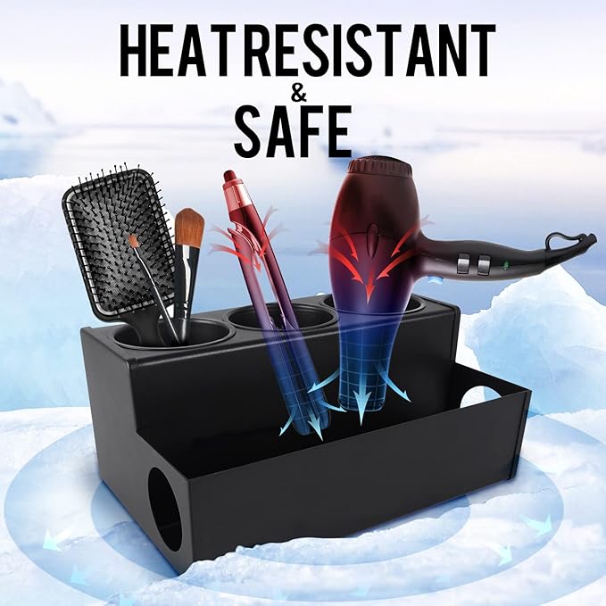 - 【One Piece Design】- This hair dryer holder adopts a one-piece design, the top storage cup is welded vertically with the product as a whole, the cup will not tilt when put in the tool, will not fall off and get lost, and the hand-polished edge makes the whole line smooth, avoid Injure your hands or young children. Securely store the iron while perming, and hair styling allows you to easily sort and access hair and grooming products, the perfect solution for clearing counter space.