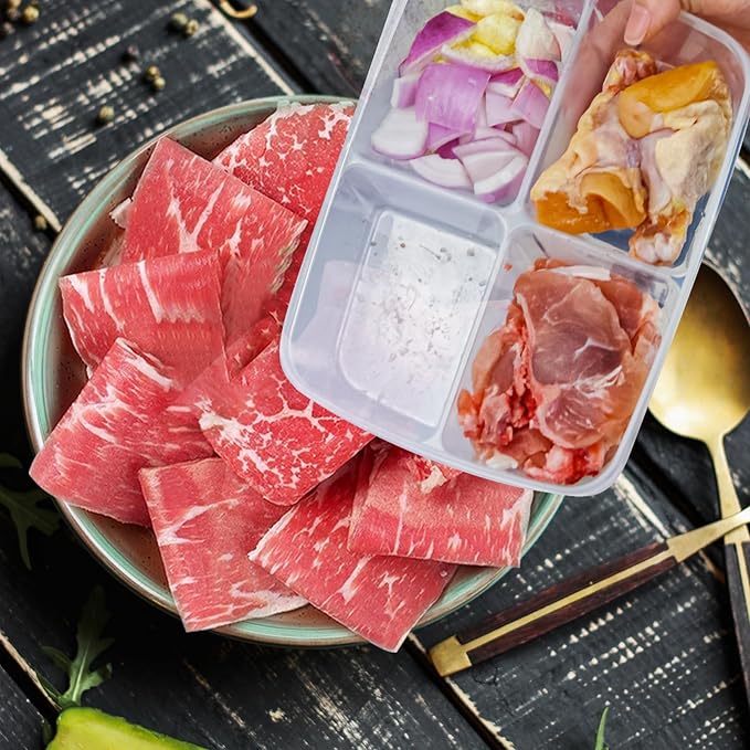 - Divided Food Containers: 4 Compartments design, suitable for storing meat, vegetable, fruit, snacks, onion, ginger, garlic and other small food items.