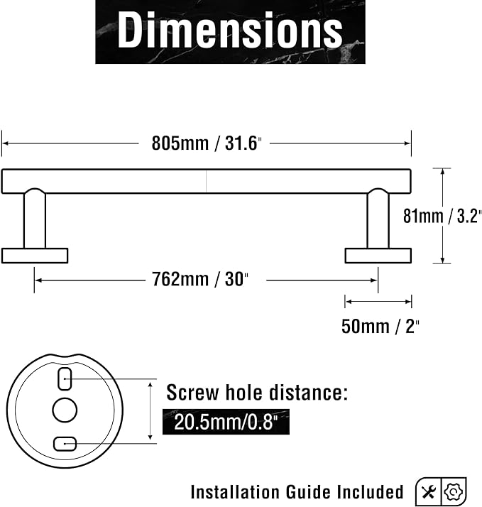 - 30 Inch Useable Dimension: The useable length of hanging the towel is 30 inch. Total length of towel bar is 31.6 inch. It is recommended to hang 1 bath towel or 2 hand towels or 2 washcloths.