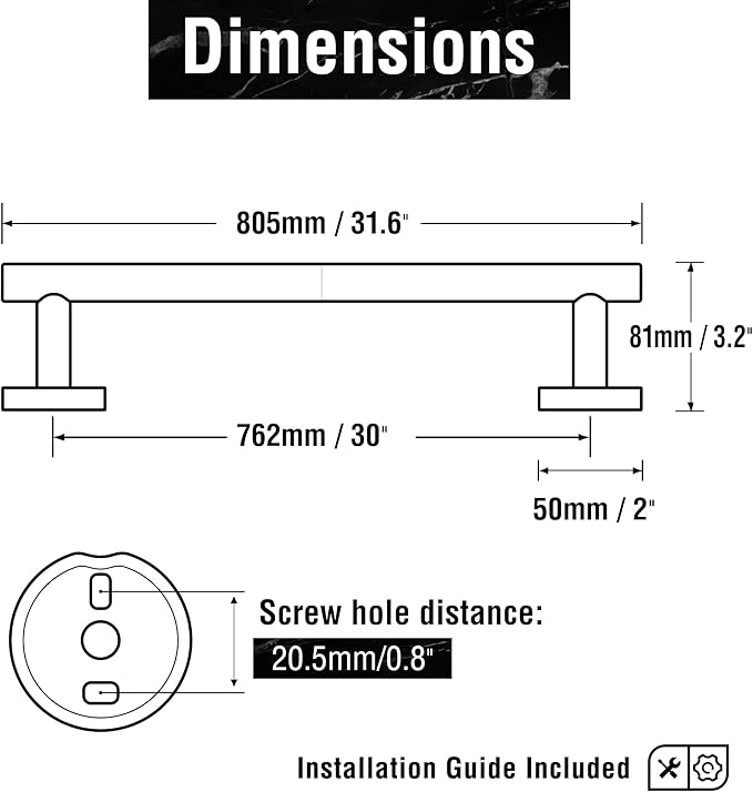 - 30 Inch Useable Dimension: The useable length of hanging the towel is 30 inch. Total length of towel bar is 31.6 inch. It is recommended to hang 1 bath towel or 2 hand towels or 2 washcloths.