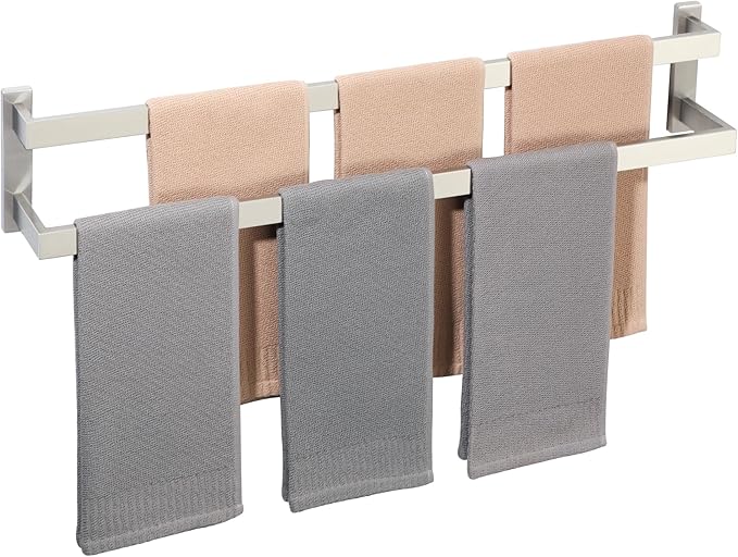 - 【Measure Before Buying】The double towel bar dimensions is 31.5''Lx6.3''Wx3.93''H, Useable Length 30.72 Inch.The double towel hanger is 1.98/3.55 Inch Separation Distance from Wall - Enough space for quick drying, hanging towel quickly.No need to fold your towel any more.If you have any questions about the brushed nickel double towel bar, please feel free to contact me at any time