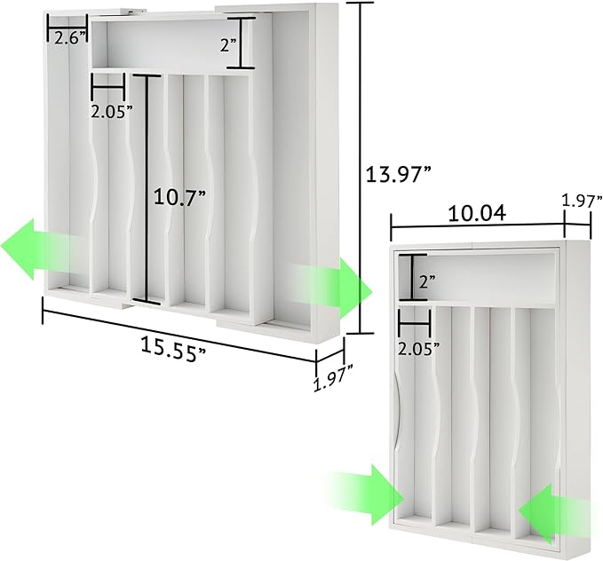 - [TWO-PIECE SET]: This 2-Piece 10.04" - 15.5" wide, 13.98" long and 1.97" deep bamboo drawer organizer can tame your out-of-control kitchen drawers, to store and organize the cutlery and kitchen utensils according to your rules, and maximize the drawer storage. Keep everything accessible and organized, so that you don't have to rifle around for your cooking tools. Beautiful and practical kitchen drawer organizer turns the cooking and tasting into things of beauty and efficiency.