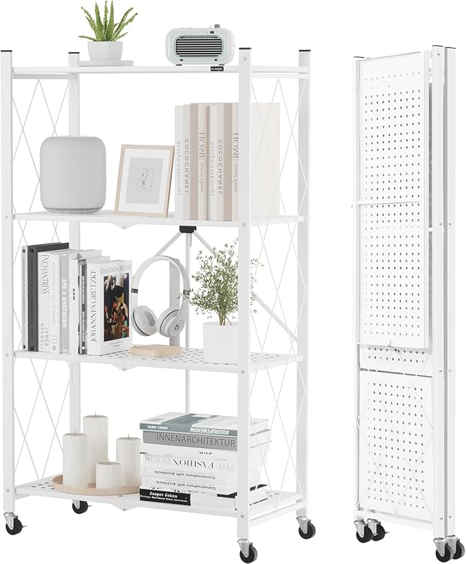 - [Multi-usage Folding Shelf] This metal shelving unit can be used virtually anywhere in the kitchen, living room, office, pantry, garage, laundry and more. Perfects for storing tools, clothes, books, and whatever is taking up space in the home or business.