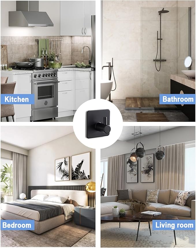 4 Pack Adhesive Hooks, Black Towel Hook for Bathrooms, Heavy Duty Stainless Steel Wall Hook, Waterproof Stick on Hook, Hooks for Hanging Robe, Key, Coat, Clothes