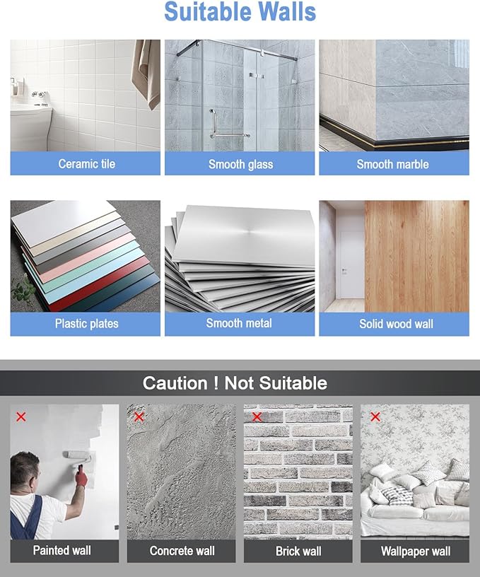 - 【APPLICABLE SURFACES】 The bathroom hooks can be easily bonded to glass, marble, wood, metal, plastic, tile and other smooth hard surfaces. (Not suitable for wallpaper or painted wall).