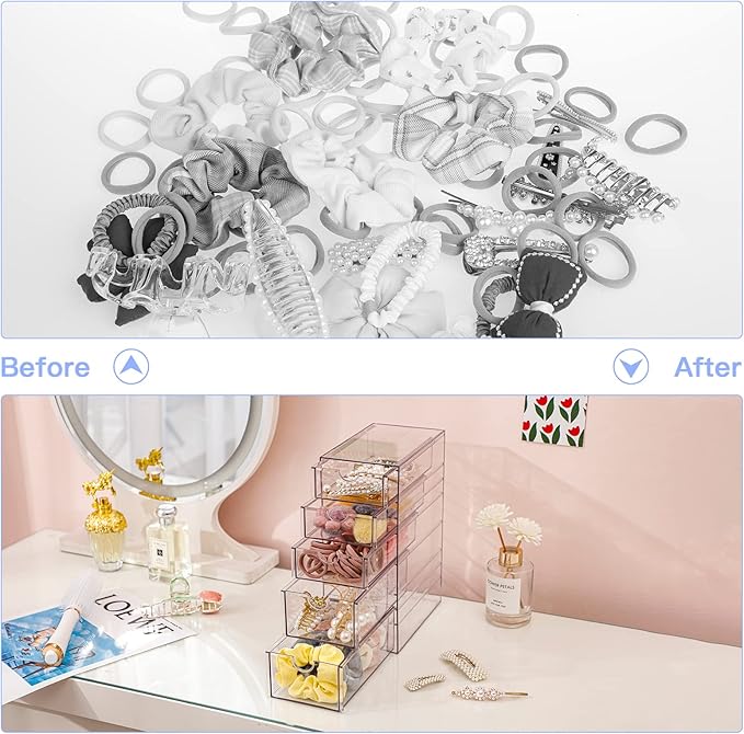 - 【5-DRAWER DESIGN】: FABROK hair accessory organizer features 5 divided pull-out drawers that provide convenient storage for kid’s hair accessories, stationery, cosmetics, glasses and more.