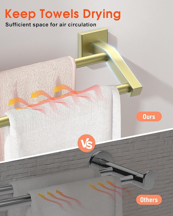 - 【Brushed Gold Finished】20"L x 5.4"W x 2.6"H; The double towel bars are finished by dazzling and gorgeous gold and sealing glaze, beautiful color, not easy to oxidize and fade; The shiny look makes it a focal point everywhere, and is also perfect for a variety of bathroom finishing styles