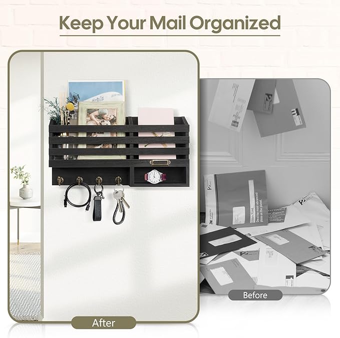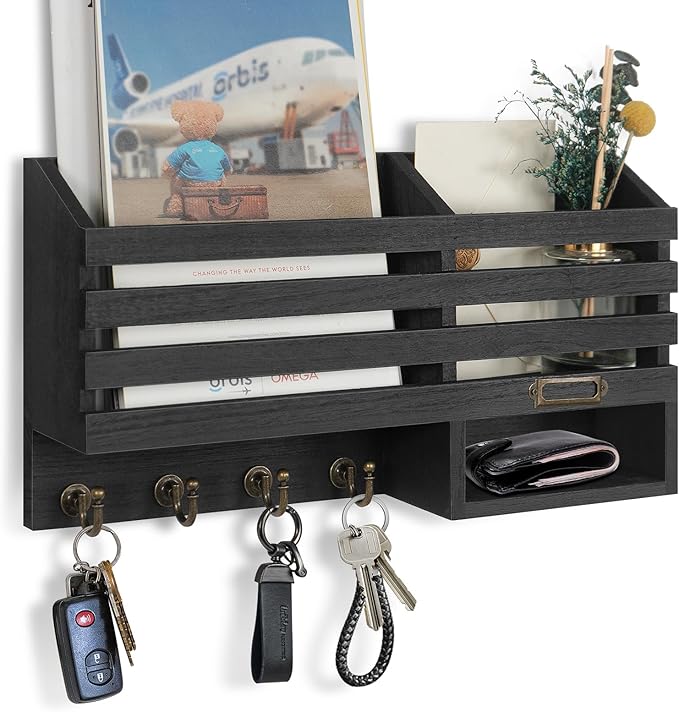- Chic Farmhouse Decor: Wall-mounted Design. This mail organizer wall mount is an elegant decoration in your house, hanging in the kitchen, entryway, hallway, mudroom, living room, etc. Blend in with the style of your home or apartment, add comfort and you’ll be like it.