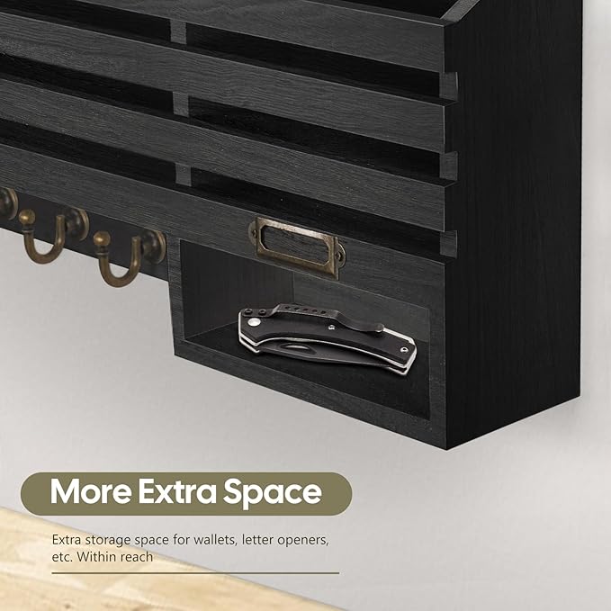 - All At One Spot: This practical key holder for wall owns two large organizers for you to neatly store mails, letters, magazines and more. With an extra shelf for sunglasses or wallet and four vintage hooks for keys, masks and even dog leash, everything is ready for you to go out!