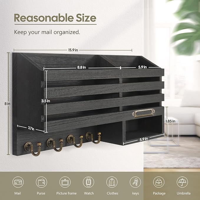 - Appropriate Size and Service: Total size of the key hanger for wall is 15.91”L x 3.39”W x 8.11”H. No terrible smell, no fading paint. If you have any questions about our mail organizer, please do not hesitate to contact us.