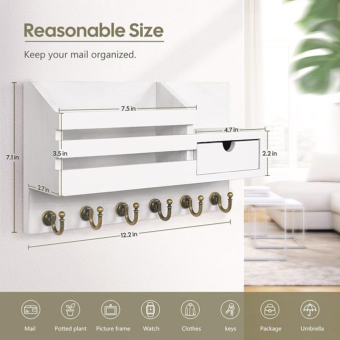 - Keep A Tidy Home: Enough hooks, good-sized mail slot, small drawer, perfectly functional for your needs. Our wall key holder has no Problem holding all those little things that clutter your space such as keys, mails, wallet, glasses, rings, cards, etc.