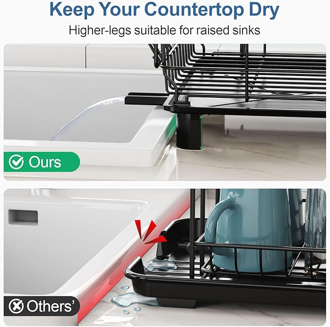 - 【Raised Tray Feet - Universal Sink Fit】In contrast to lower-tray competitors, we have raised the tray feet of this dish drainer, solving drainage pipe blockage caused by raised sinks, ensuring free-flowing, seamless drainage