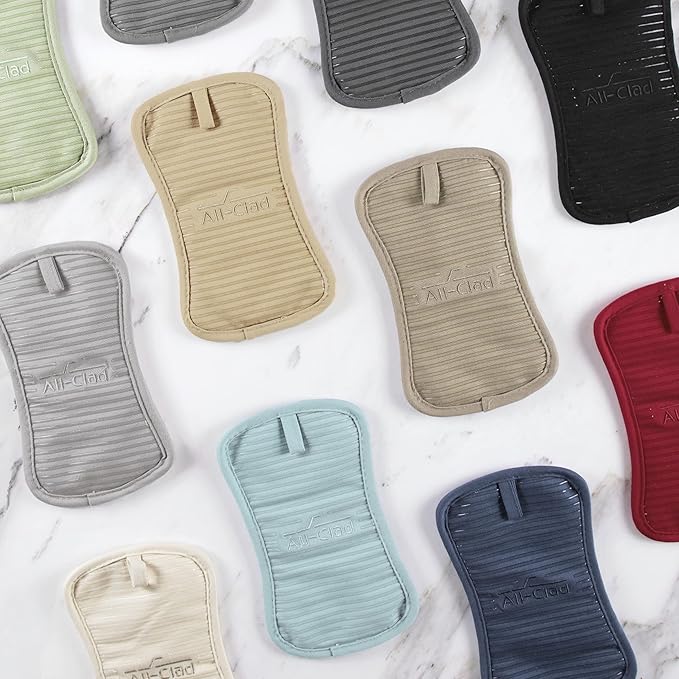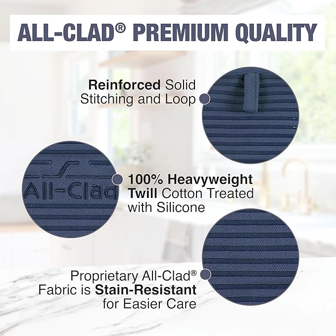 - MAXIMUM HEAT PROTECTION. All-Clad Pot holders with silicone grip offer heat resistance up to 500 degrees Fahrenheit (260 degrees Celsius). Having a reinforced thumb area made of fire resistant fibers means your hands will be protected when grabbing hot items from the oven or grill.