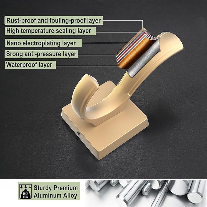 - 【Heavy Duty Gold Towel Hook】 Easily hang heavy items like Backpack, towels, hand towels, heavy bath towels, coats, key,bags, clothes, kitchen utensils, etc. Made of thick aluminum alloy, this towel hook is hard, durable and rust-proof. Holds 50 lbs with ease!