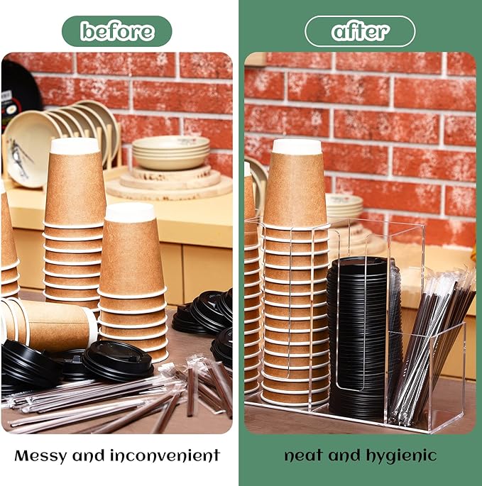 - Extensive Usage: the paper cup organizer can hold paper cups, plastic cups, coffee cups, conical cups, lids, straws, etc. and it is ideal for serving in restaurants, lounges, coffee stations, bars, buffets, kitchen cabinets, countertops, etc