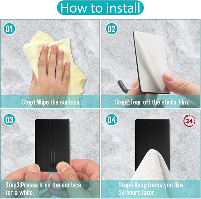 - Long-term USE: The adhesive towel hooks are made of high-quality 304 stainless steel which is waterproof, anti-corrosion, and anti-rust. The original brushed silver and electroplating black color will not fade during your long-term use.