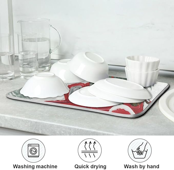 - QUICK DRY: The surface of the kitchen drying mat is made of water-absorbent polyester material, and the middle is composite sponge material, which can absorb water quickly. Soft cushioned drying surface to protect dishes, glassware, serveware, flatware, and your countertops, cushions delicate dishes and stemware.