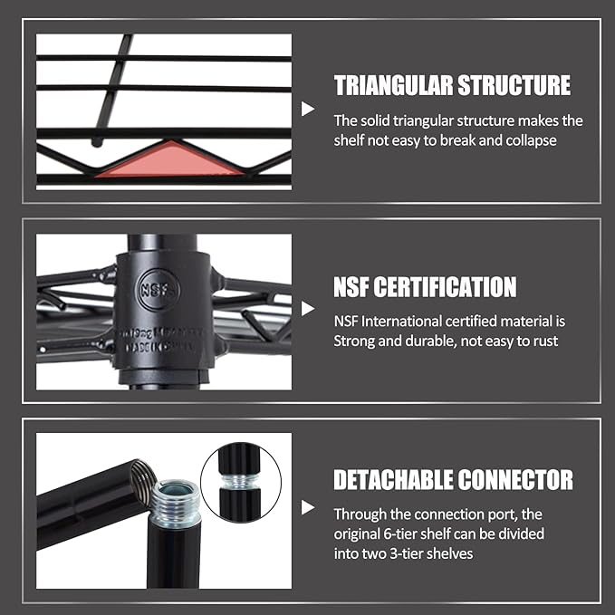 - 【Sturdy and Durable】Our storage shelves is made of heavy-duty steel wire.Durable enough and not easy to accumulate dirt and corrosion. Each shelf can support a weight capacity of up to 150lbs with a maximum weight capacity of 900lbs for entire unit. It can meet most storage and all home storage needs.