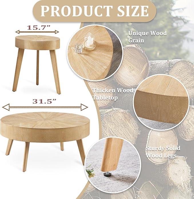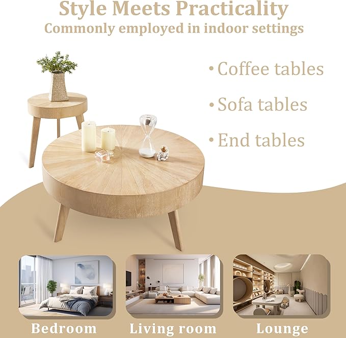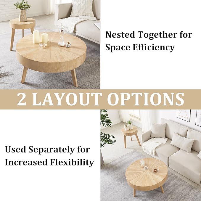 - đ¤ăSolid Wood Coffee Talbe for Living RoomăCrafted from high-quality solid wood, this rustic round coffee table set of 2 exudes a timeless charm and exceptional durability. The natural grain patterns and rich texture of the wood make each table unique and visually appealing. Its compact size and rounded shape make it an ideal choice for small spaces, while adding a touch of sophistication to larger rooms.