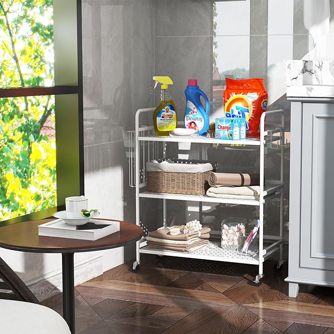 - 【Multi purpose】This trolley can be used in kitchens,bathrooms, children's rooms,offices, living rooms,bedrooms,and can be used as spice racks,bookcases,toy racks, flower racks,printer racks,etc.In particular,the hook and basket design makes it easier for you to place small items,newspapers and magazines,etc.This trolley makes your home and office more tidy and orderly.The powerful storage function brings you a comfortable experience.