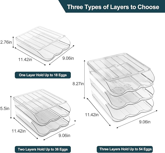 - Size and Capacity Wide Application:Three layers egg hold size 11.42"L x 9.06"W x 8.27"H. Each layer can hold 18 eggs, Three layers can hold up to 54 eggs. Perfect as egg container for refrigerator, kitchen, cabinets, table and restaurant.