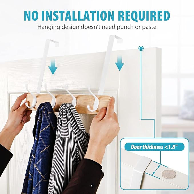 - Easy Installation: Say goodbye to complicated setups! Our door hanger requires no drilling—simply hang it over the door for quick and immediate use. Designed to fit doors up to 1.7 inches thick, just ensure there's a gap of more than 0.08 inches (the thickness of a coin)between the top of the door and the frame